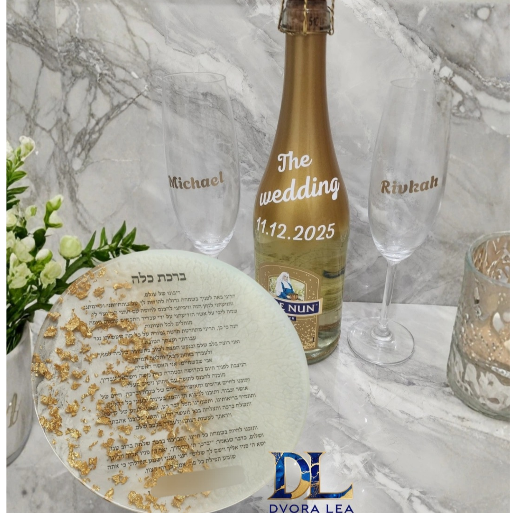 ברכת כלה בעיצוב אישי ויחודי ליום מיוחד שלכם בתוספת בקבוק שמפניה עם תאריך החתונה וזוג כוסות שמפניה ממותגת עם שמות החתן והכלה